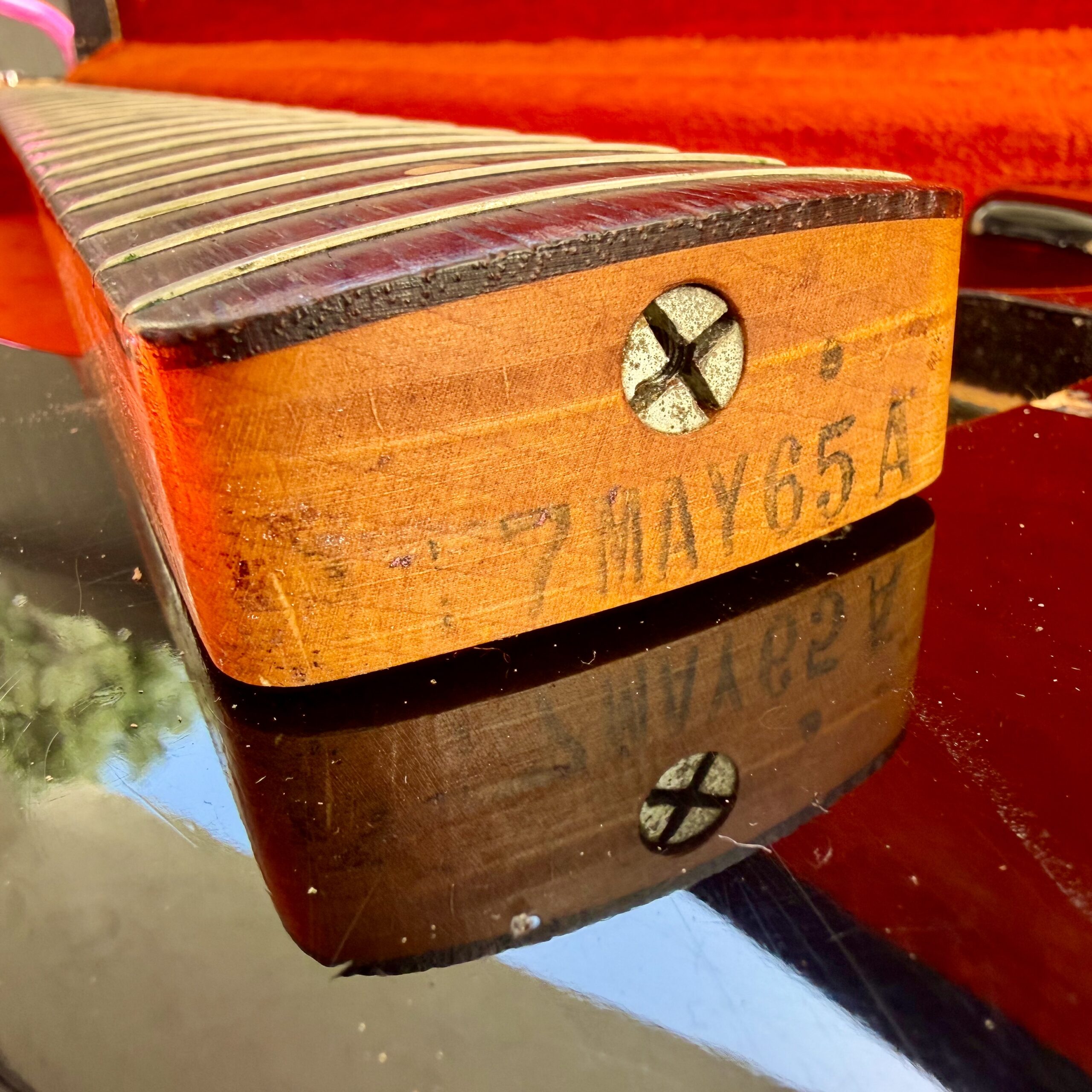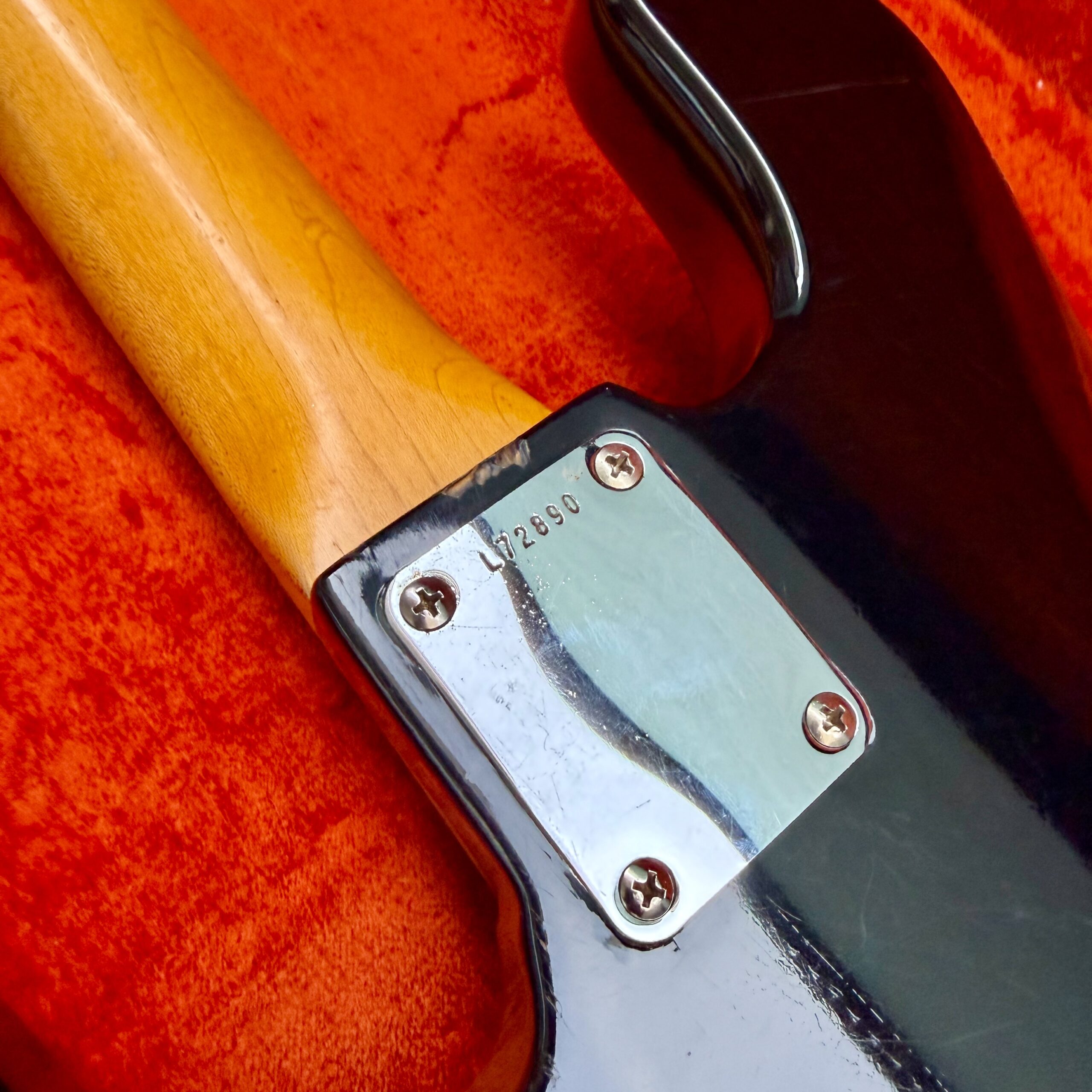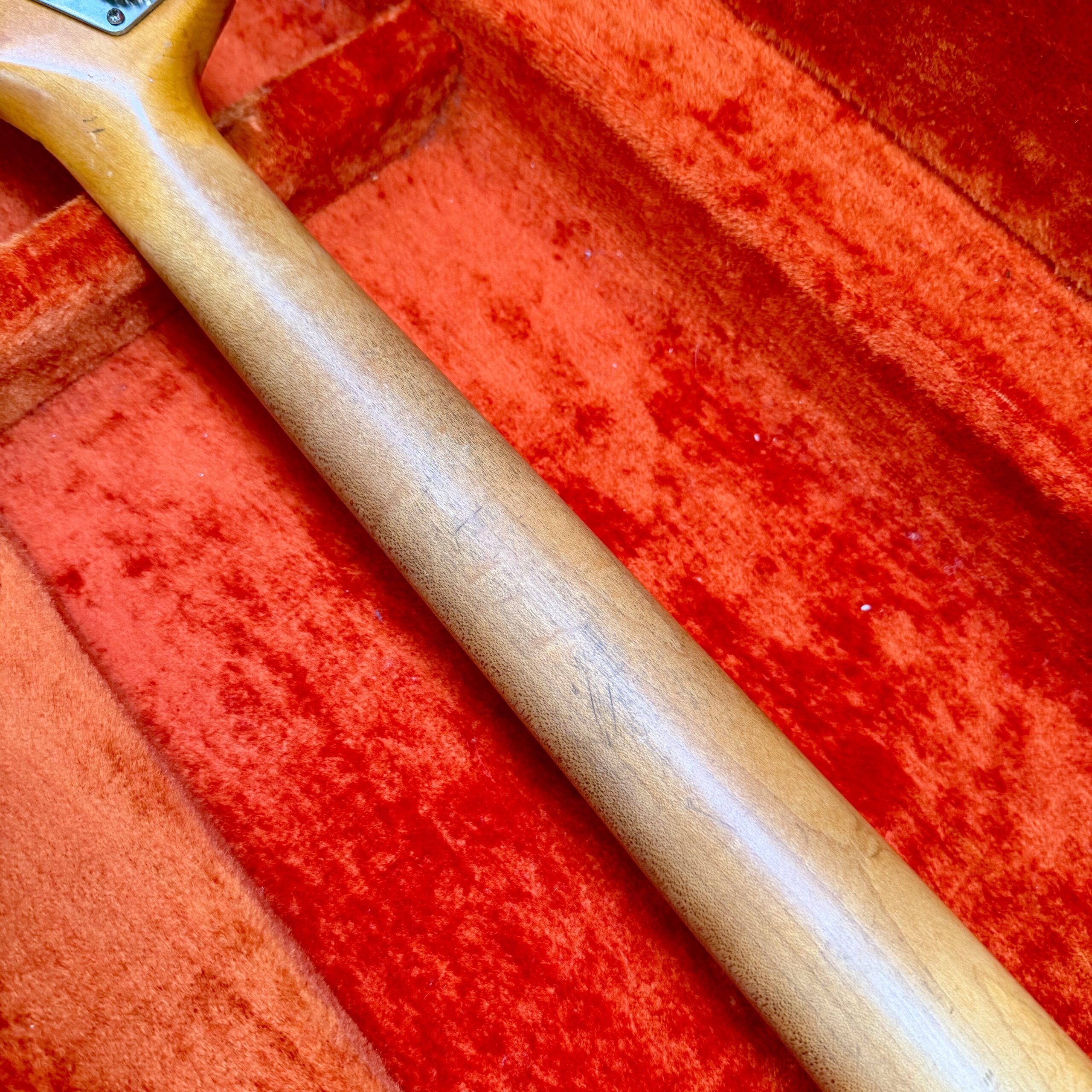The neck is to die for. Original finish with the classic worn area on the back, 1.49″ nut width, 7.25″ radius, 0.76″ thickness at the 1st fret and 0.97″ at the 12th, a profile that plays as good as it feels. Pots and pickups are both dated ’65, truss rod works flawlessly in both directions, and original frets still have good life ahead. Note: pickup covers are missing. There are zero extra routes or modifications anywhere on the instrument.