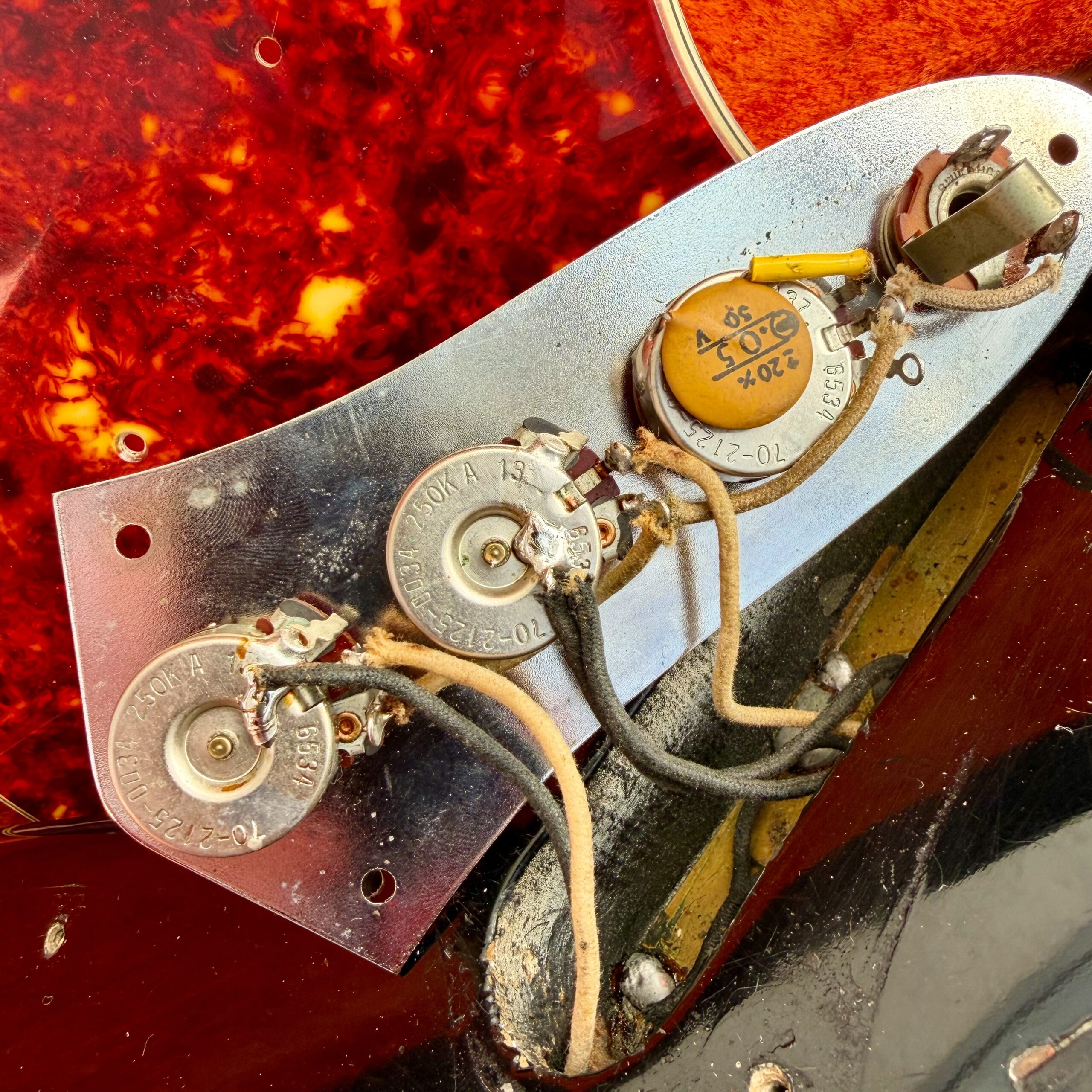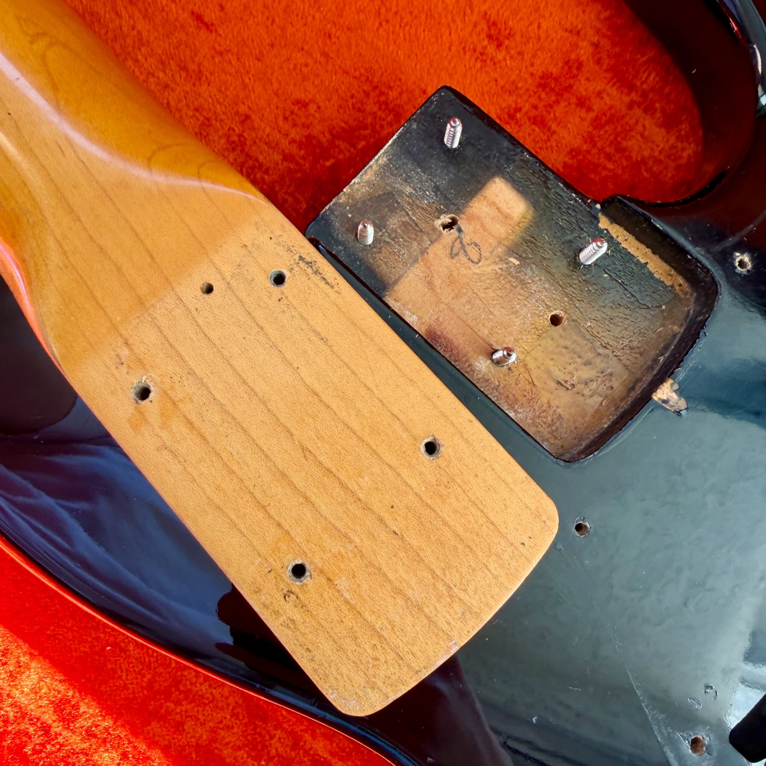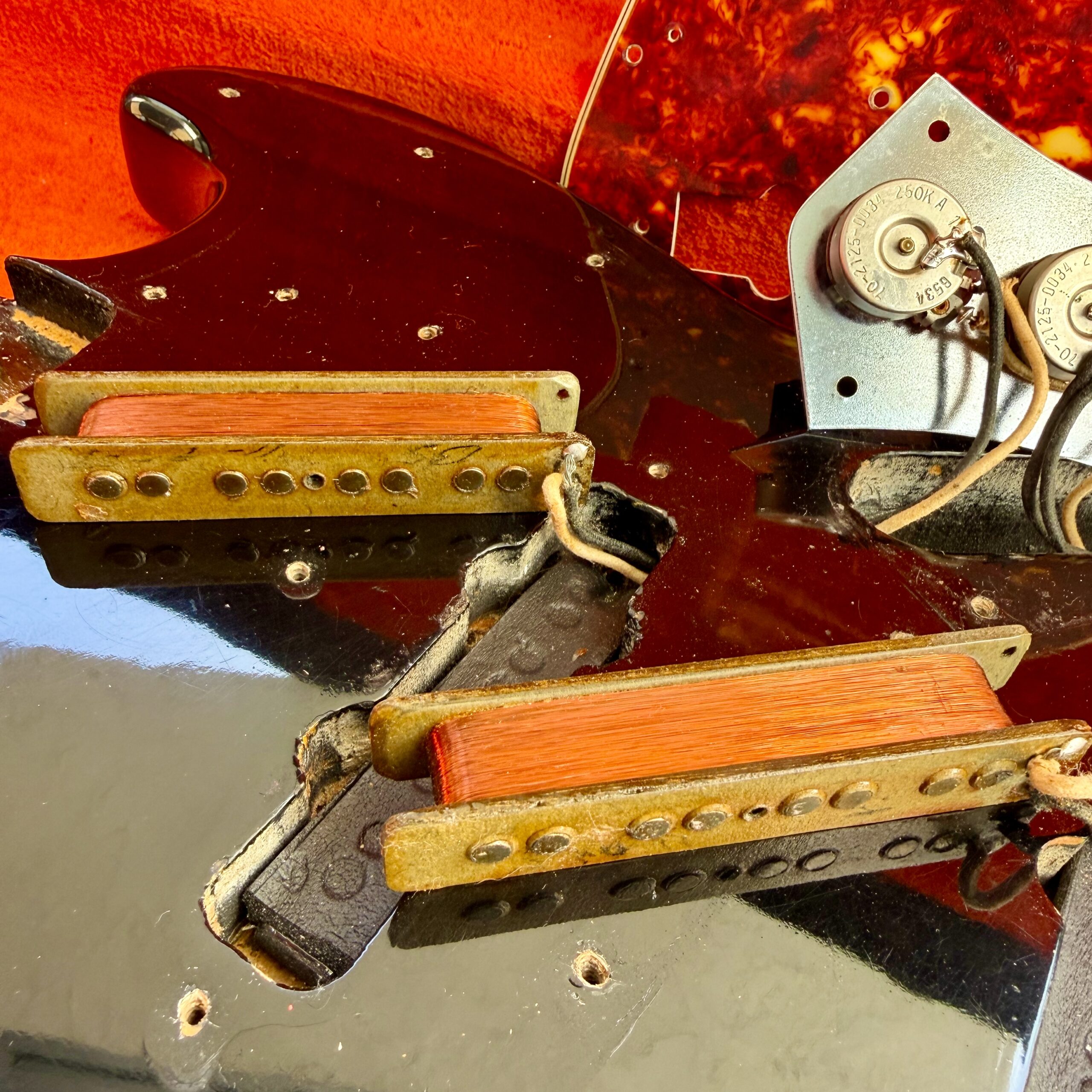 The neck is to die for. Original finish with the classic worn area on the back, 1.49″ nut width, 7.25″ radius, 0.76″ thickness at the 1st fret and 0.97″ at the 12th, a profile that plays as good as it feels. Pots and pickups are both dated ’65, truss rod works flawlessly in both directions, and original frets still have good life ahead. Note: pickup covers are missing. There are zero extra routes or modifications anywhere on the instrument.