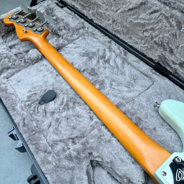 We carefully sourced an original Fender American Vintage II 1960 Precision Bass neck, finished in nitrocellulose lacquer, with a beautiful slab rosewood board, bone nut, and outfitted it with Gotoh Res-O-Lite aged nickel tuners and string tree. This neck feels just like an early ’60s Slab board P: Wide and thin, resonant, lightweight, and remarkably close in character to early slab Precisions we’ve handled over the years.