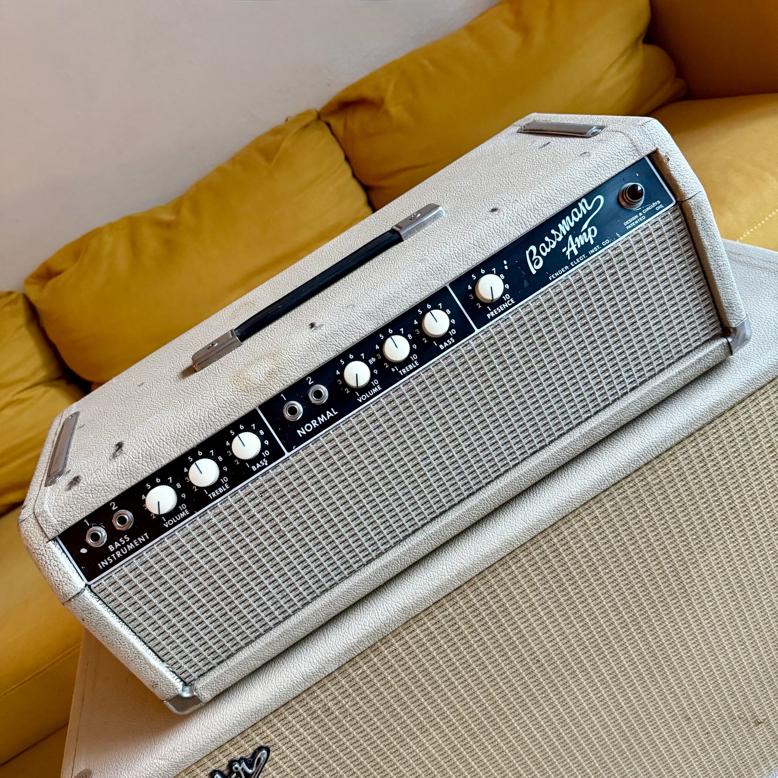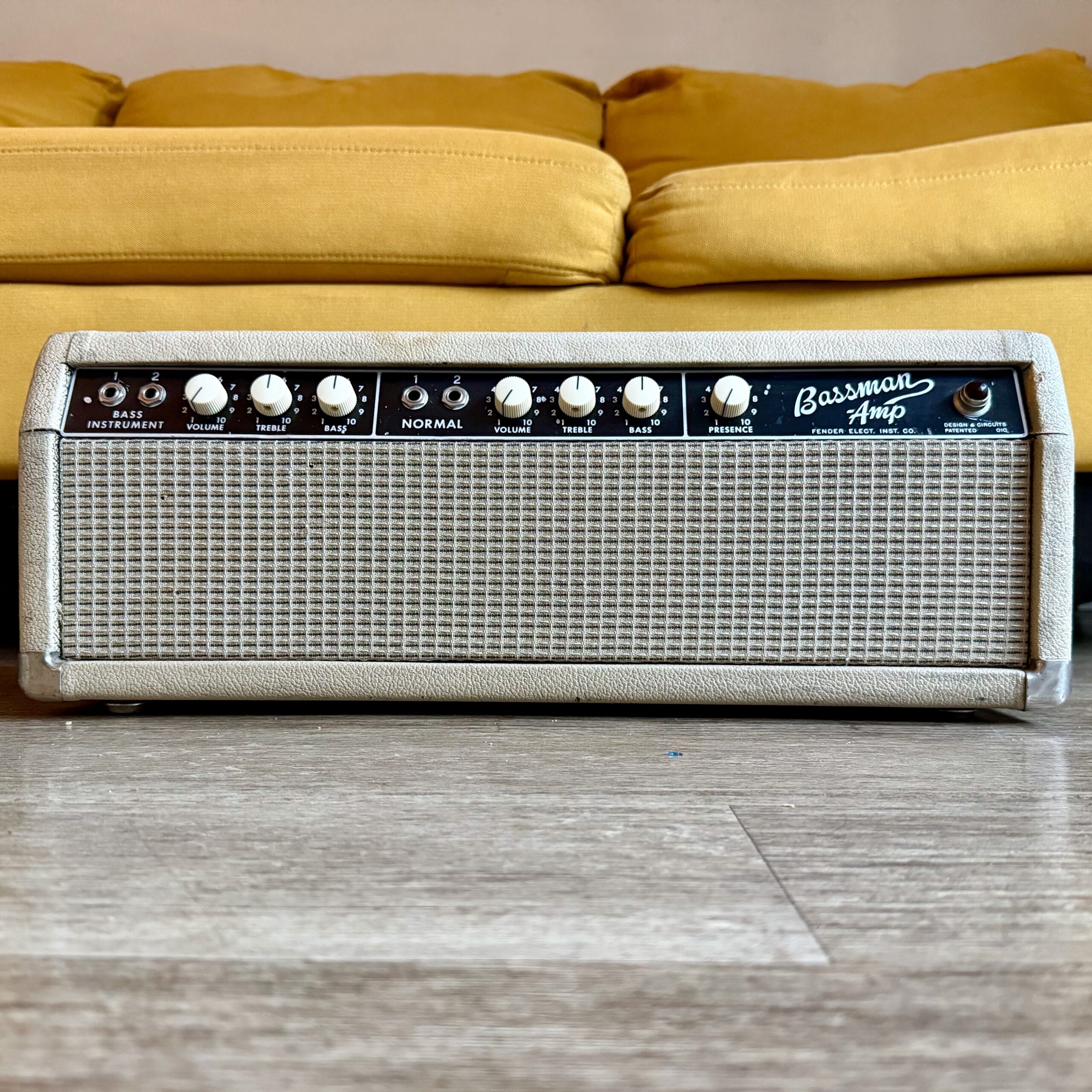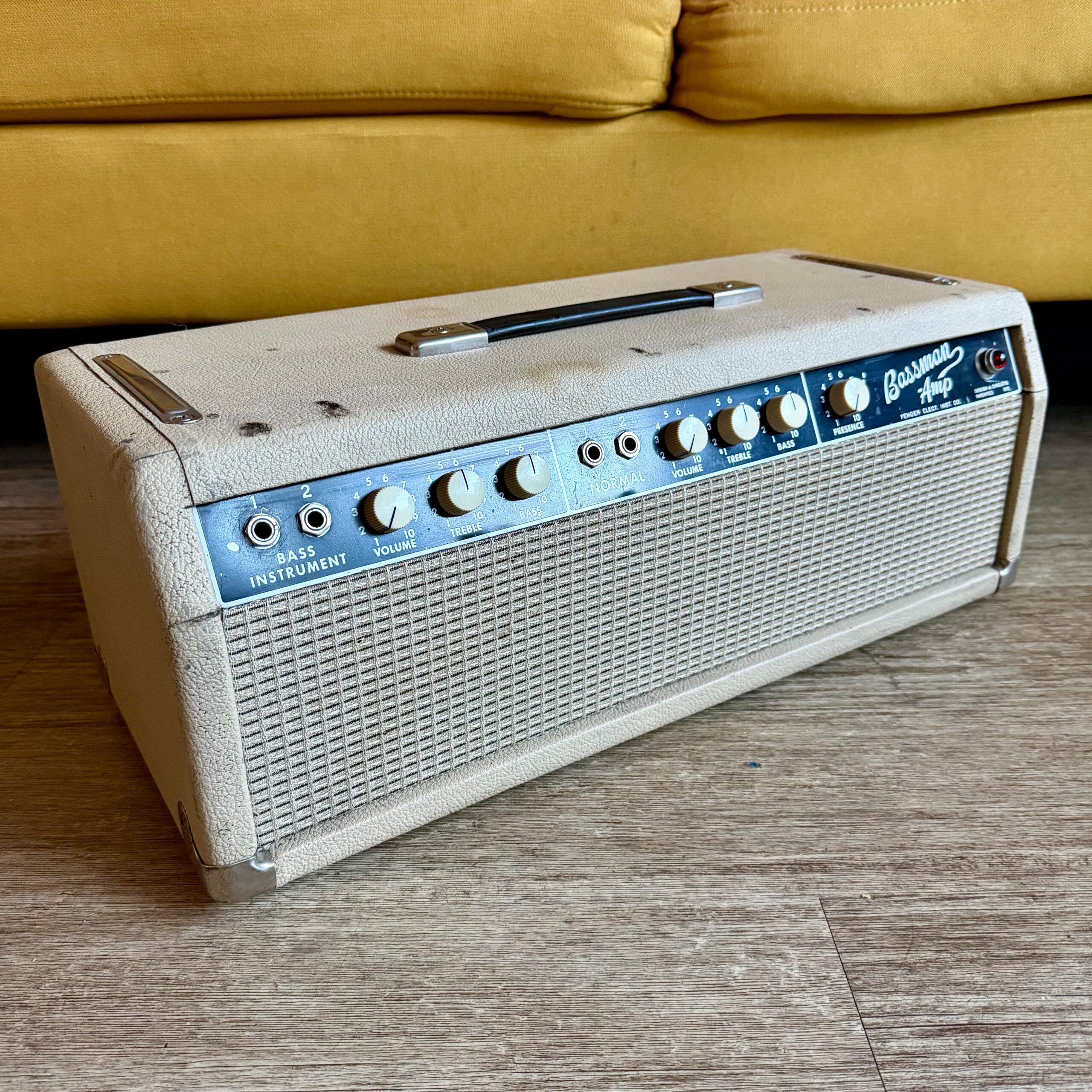 up for sale, here is a transitional early ’64 Fender Bassman Amp head, featuring the 6G6-B circuit in original Blonde tolex with a Black panel. This is one of the last Bassman heads produced before Fender transitioned to the AA165 circuit and full Black tolex production.