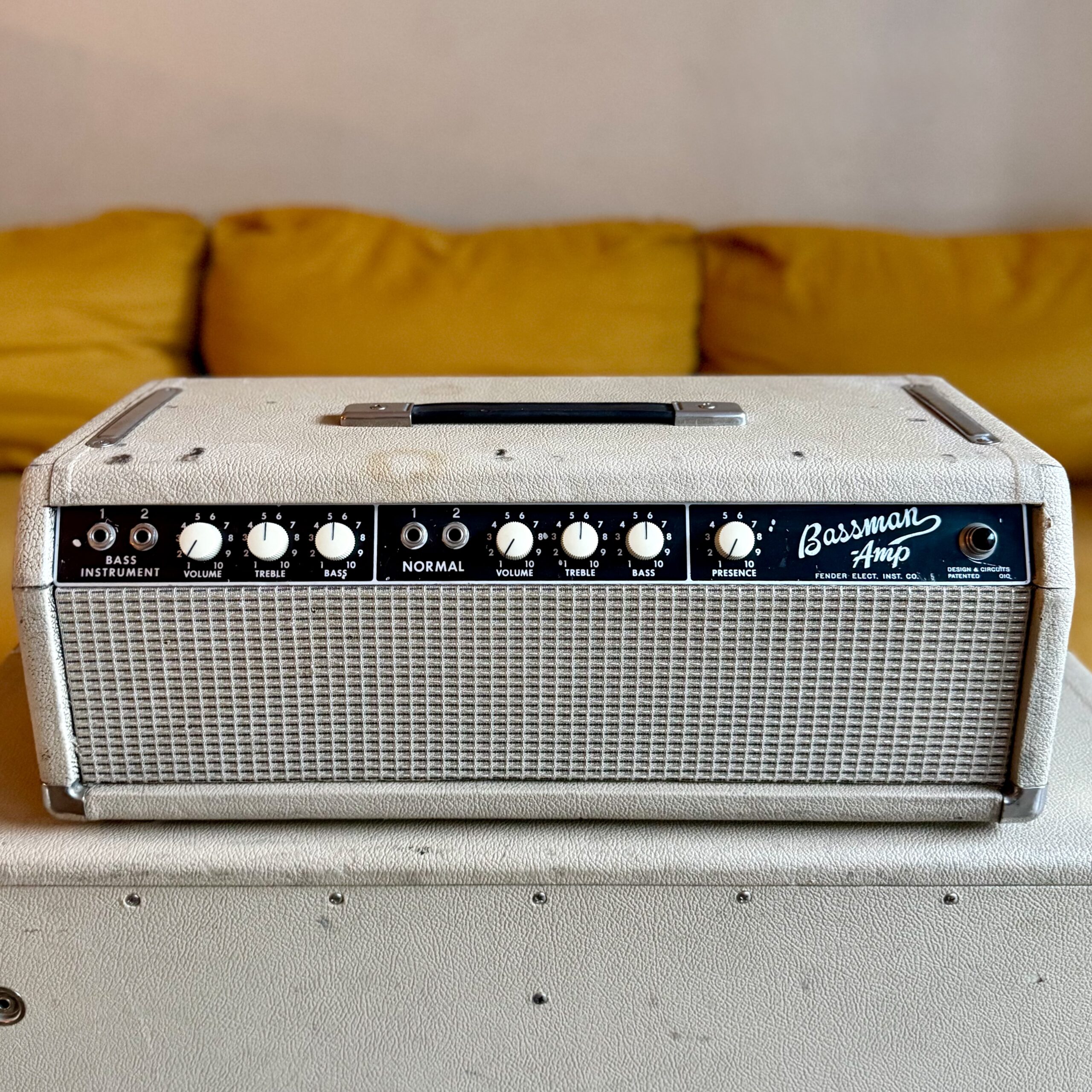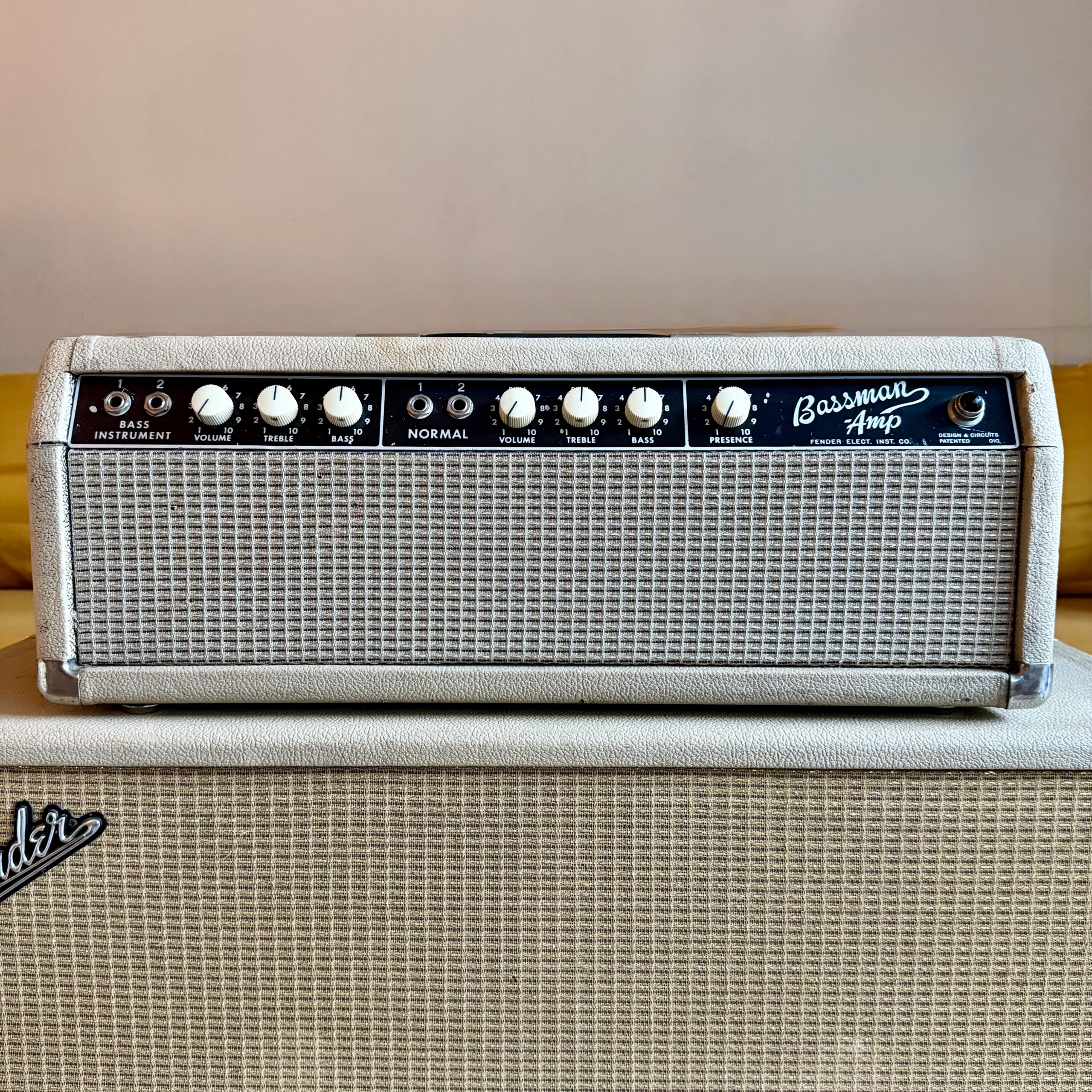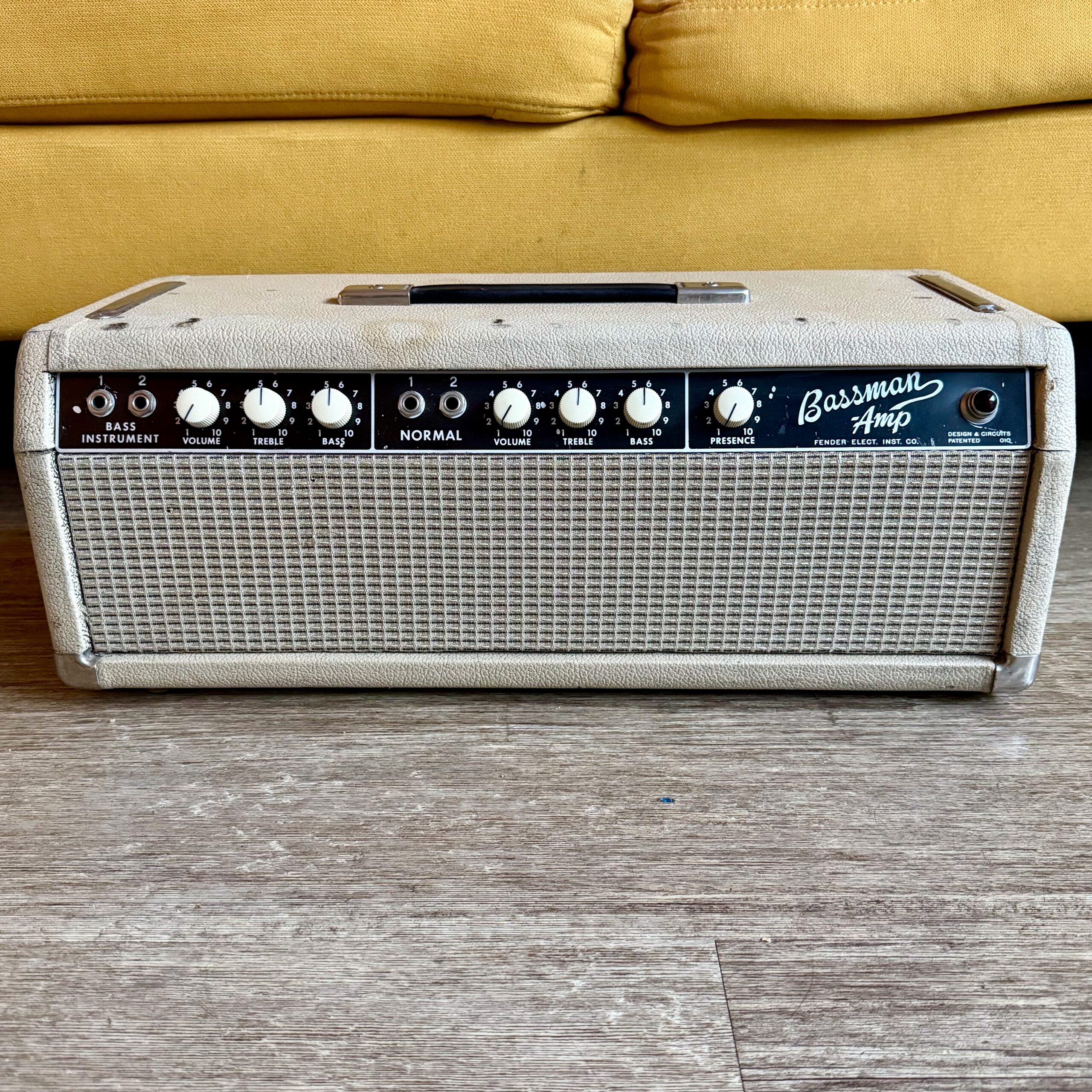 up for sale, here is a transitional early ’64 Fender Bassman Amp head, featuring the 6G6-B circuit in original Blonde tolex with a Black panel. This is one of the last Bassman heads produced before Fender transitioned to the AA165 circuit and full Black tolex production.