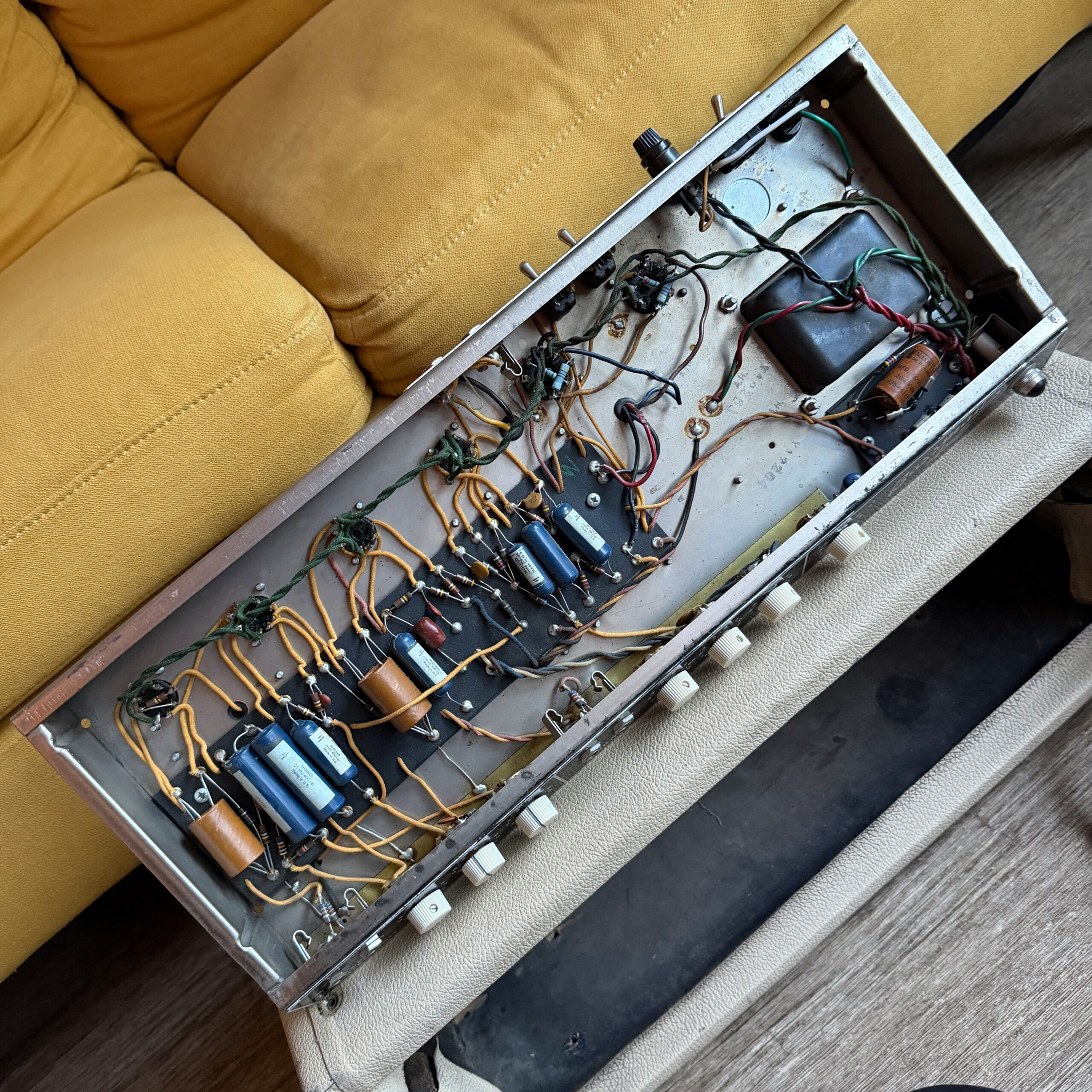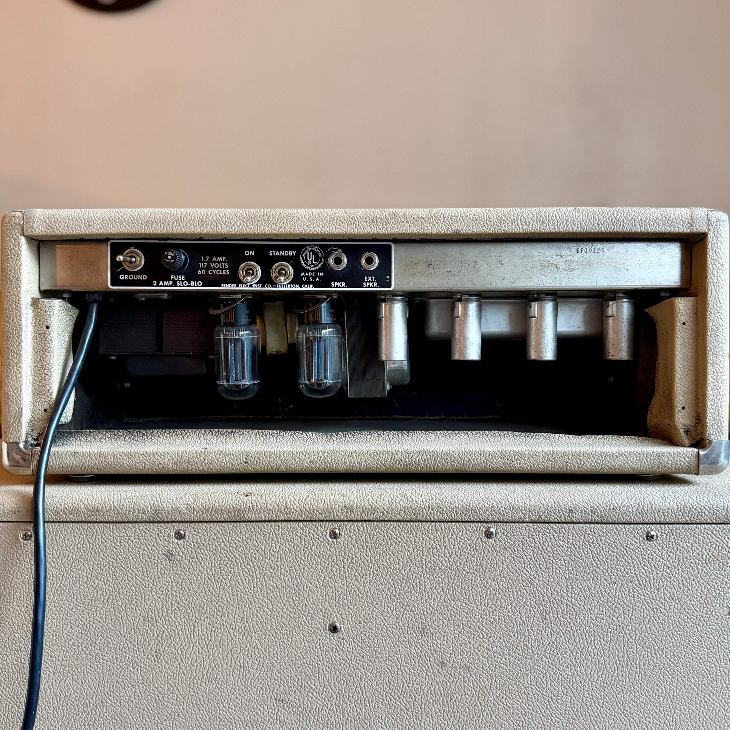 The amp is all original, including all transformers, original blonde tolex, and original grille cloth. The only noted details are the missing back panel, the badge logo and a properly installed three prong power cord, for safety reasons. Otherwise, the amp remains with no mods.